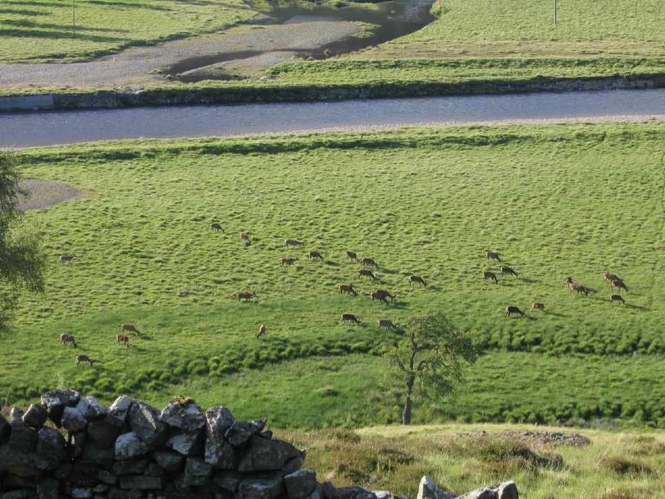 Skotland: Dådyr på eng ved Dee floden.